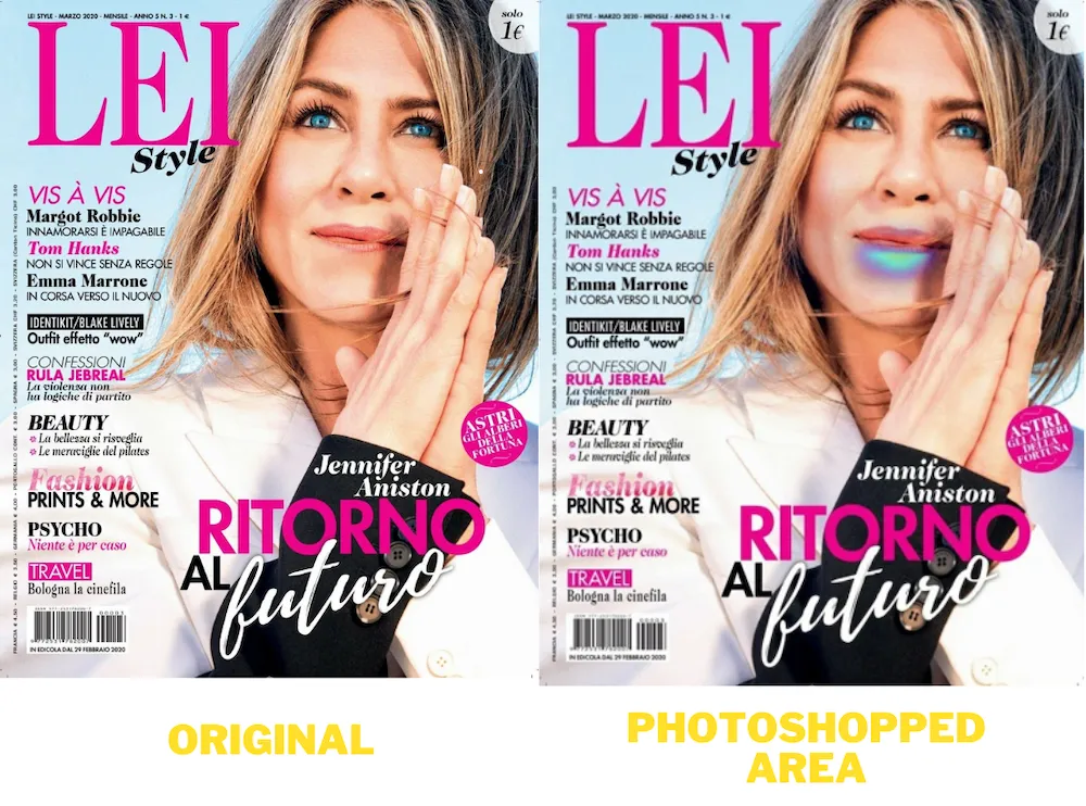 We examined 20 Magazine Covers featuring Jennifer Aniston with a close shot of her face. Of these, the AI picked up clear use of the “Face-Aware Liquify” photoshop tool in 50% of the samples. The most frequently edited parts of her face in the 10 examples we found were: