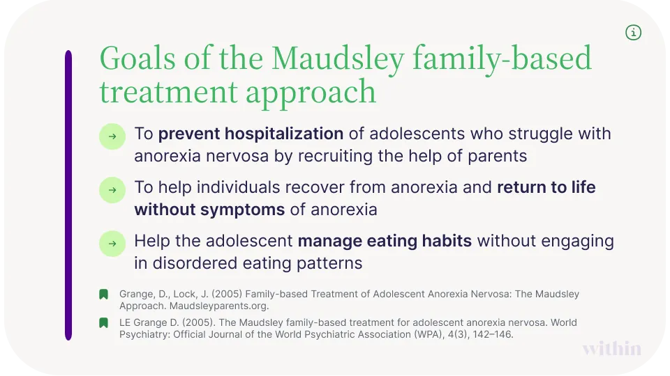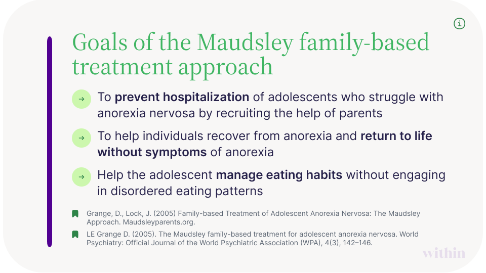The Maudsley approach to anorexia nervosa treatment, also sometimes called the Maudsley method, is a family-based form of care, directly involving parents or caretakers in aspects of recovery such as meal planning and monitoring behavior.