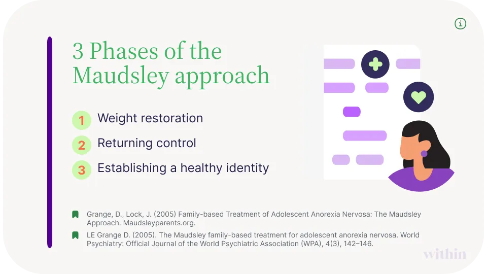 Phase one of the Maudsley method focuses on weight restoration. During this time, the therapist educates the patient on the long-term dangers of malnutrition, such as hormone imbalances, heart health risks, and cognitive/emotional changes and challenges.