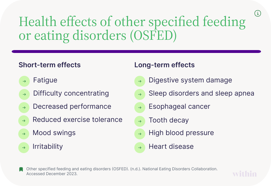 Again, the variety of ways OSFED can present can lead to several different health effects. In the short term, these may be more mild or uncomfortable, but if left untreated, the impact of OSFED can be severe and potentially even life-threatening.1