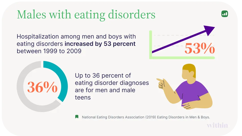 Yet, despite these disturbing trends, males of any age are also less likely to seek treatment for an eating disorder and less likely to be diagnosed, meaning they're less likely to get the help they need.4