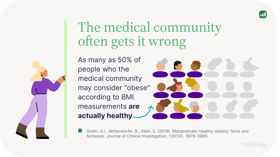 Some studies have concluded that as many as 50% of people who the medical community may consider "obese" according to BMI measurements were actually healthy and not experiencing the symptoms of a metabolic syndrome, such as high blood pressure, high blood sugar, and abnormal cholesterol levels.2 These issues are often a more significant indicator of someone's overall health than weight.